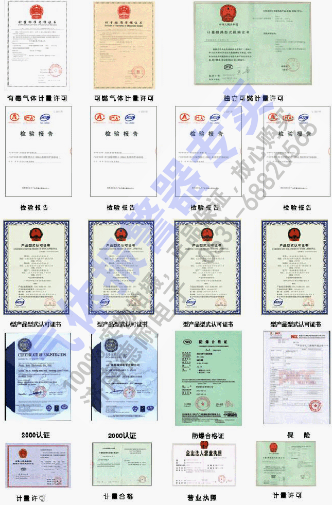 氣體報(bào)警器產(chǎn)品資質(zhì)證書: ISO9001:2000 質(zhì)量管理體系標(biāo)準(zhǔn), 消防產(chǎn)品型式認(rèn)可證, 檢驗(yàn)報(bào)告, 制造計(jì)量器具許可證,防爆合格證。